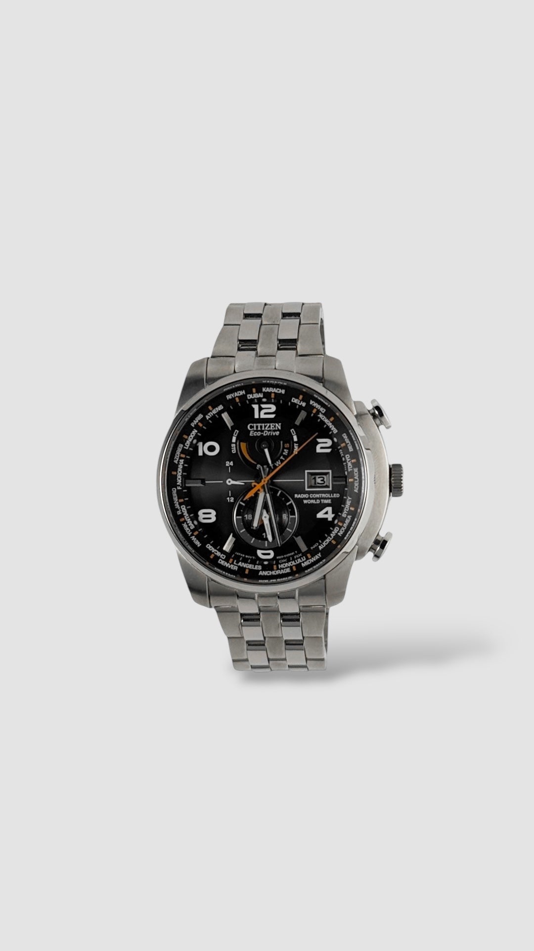 12-hour dial, chronograph, date indicator, alarm, perpetual calendar, atomic/radio-controlled timekeeping, luminous hands, push/pull crown, world time.