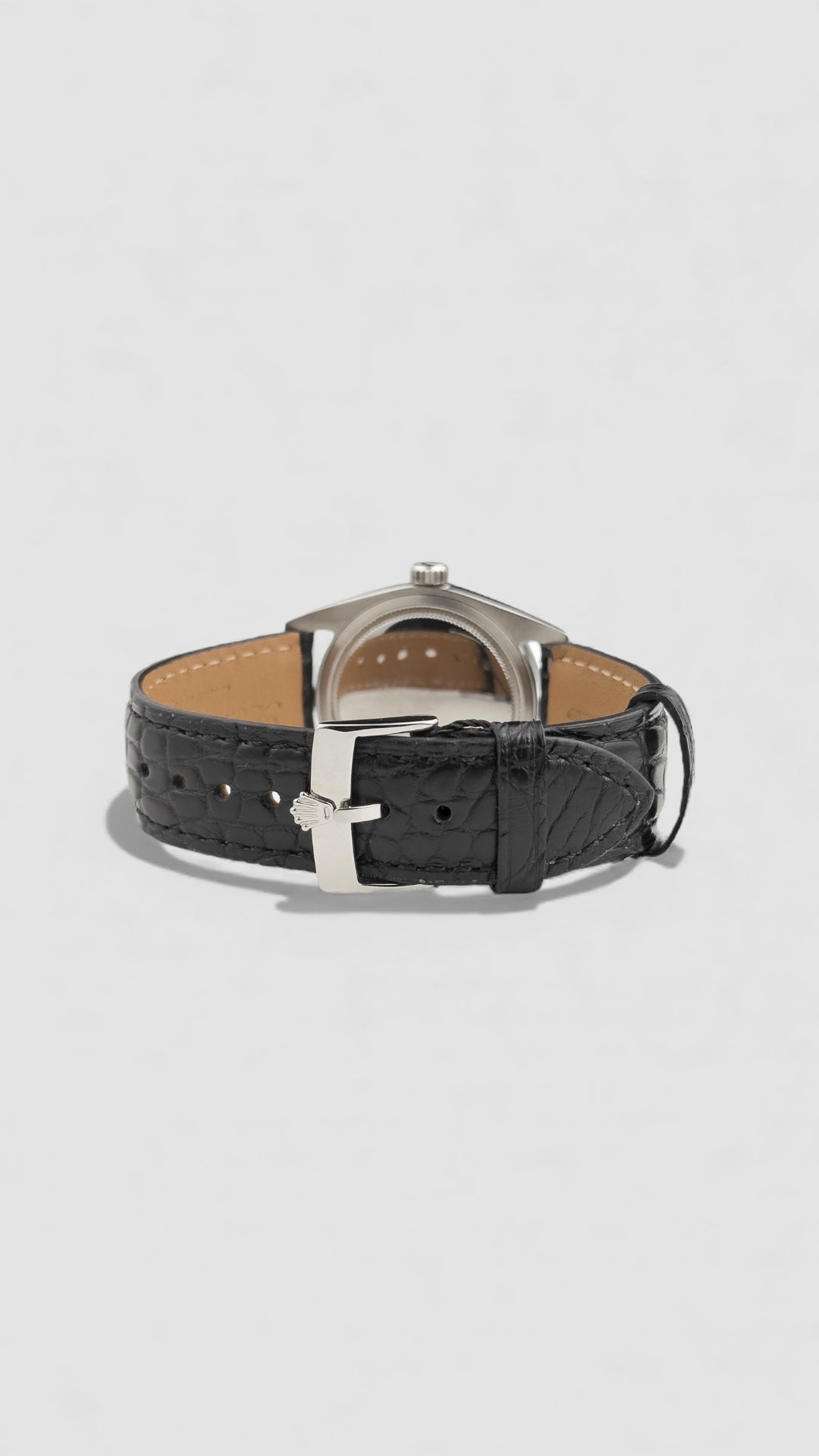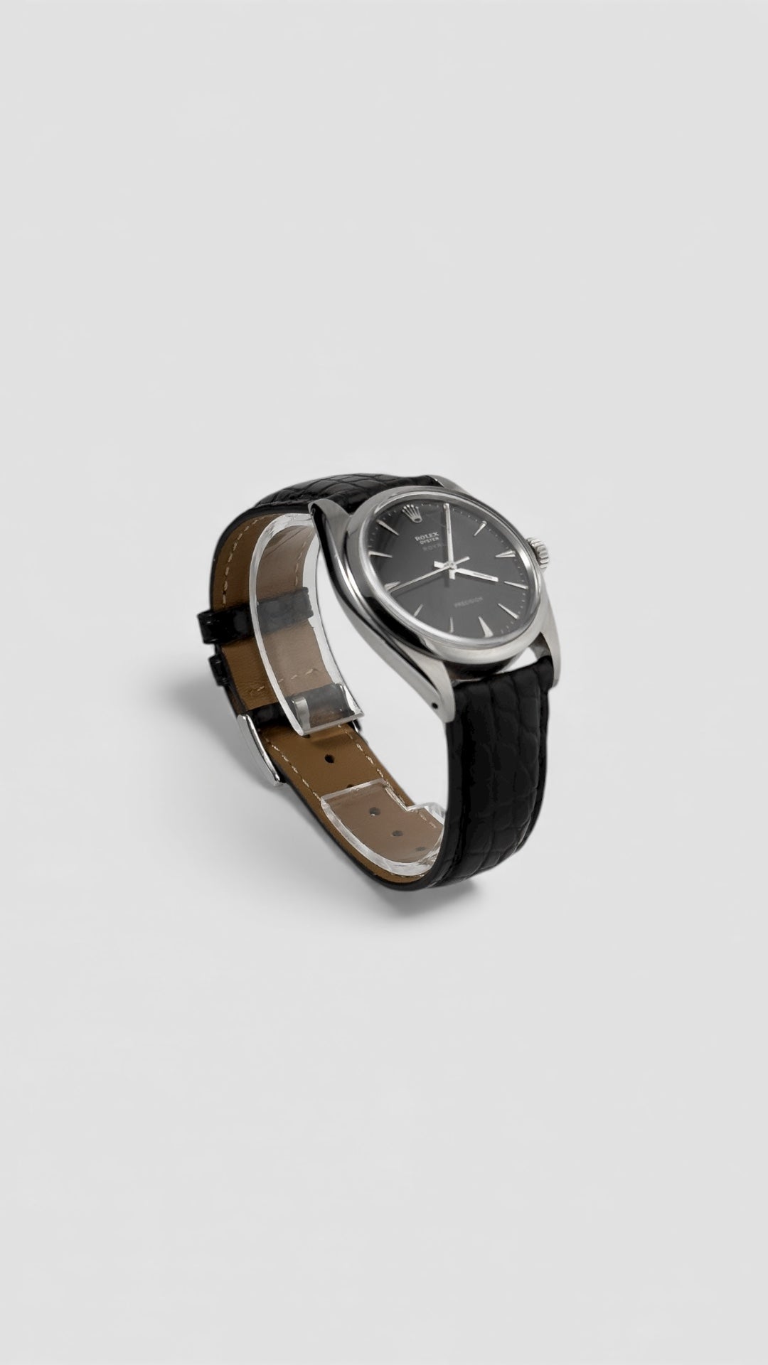 The stainless steel 34.5mm case and gloss black dial create a refined and understated vintage aesthetic. Its original steel alpha hands and hand-wound mechanical movement make this watch a genuine collector’s piece — a true nod to the golden era of Rolex craftsmanship.