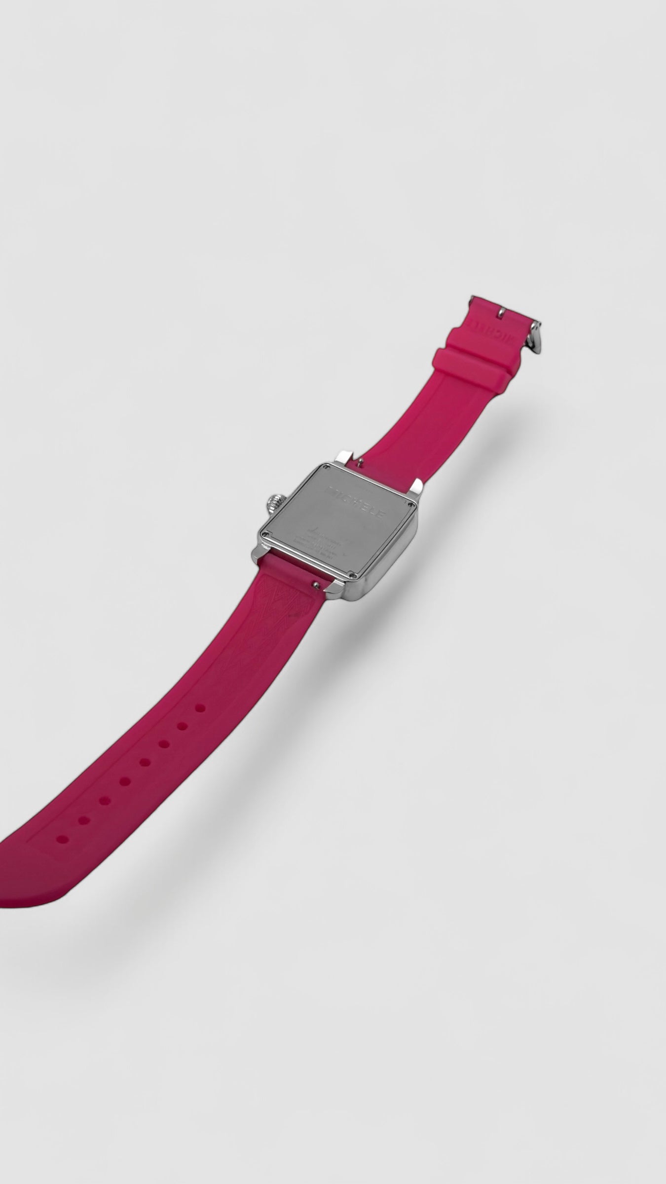 The vibrant pink silicone strap adds a fun, contemporary edge while ensuring all-day comfort. Finished with a classic tang buckle, it provides a secure and adjustable fit for any wrist.