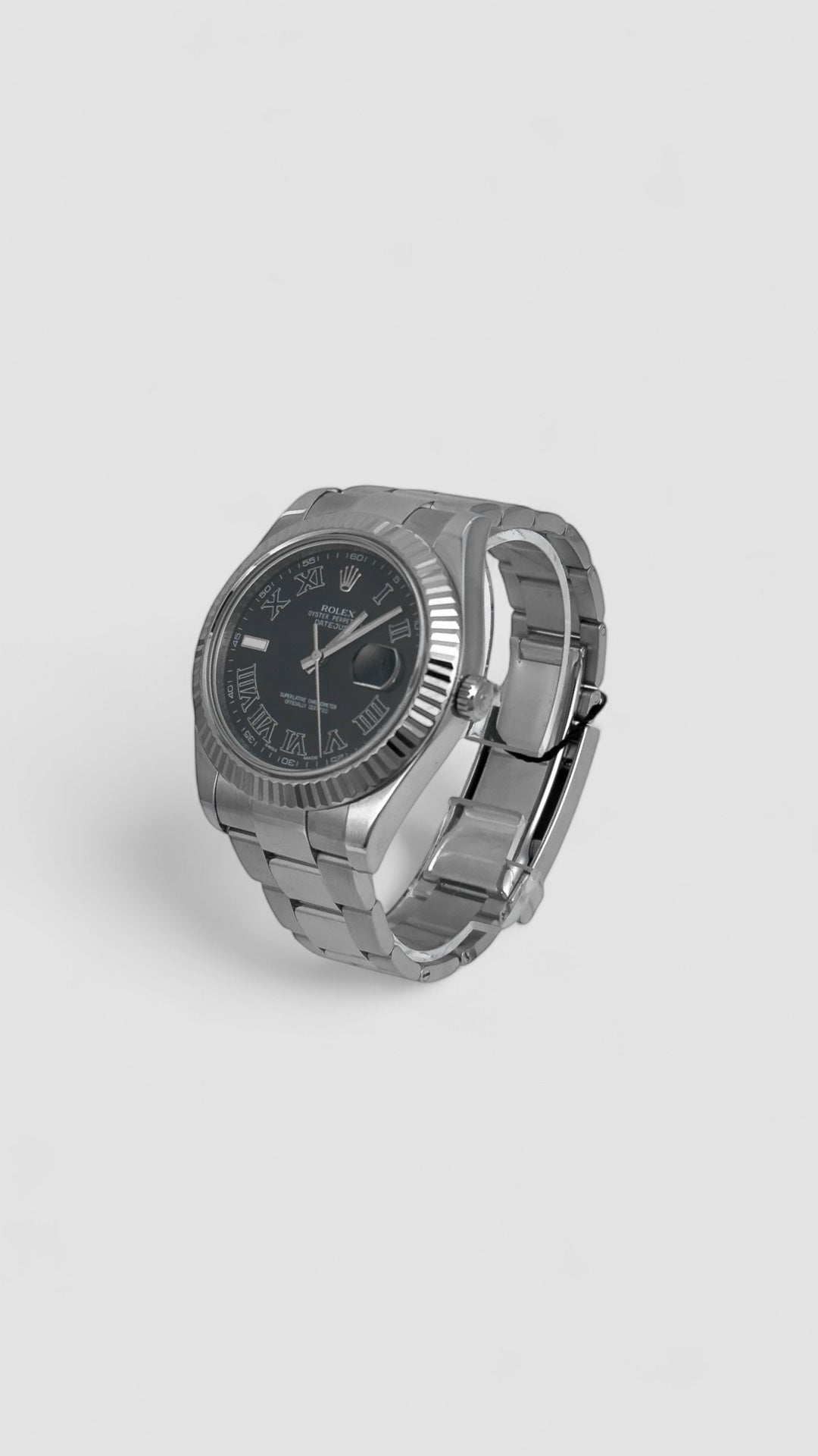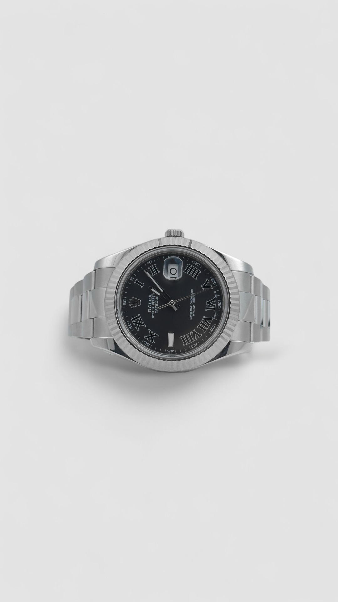 The 41mm Oyster case features a fluted 18K white gold bezel, while the dark slate Roman dial with a date display offers a refined and distinguished look. A sapphire crystal with Cyclops lens ensures exceptional clarity and scratch resistance.