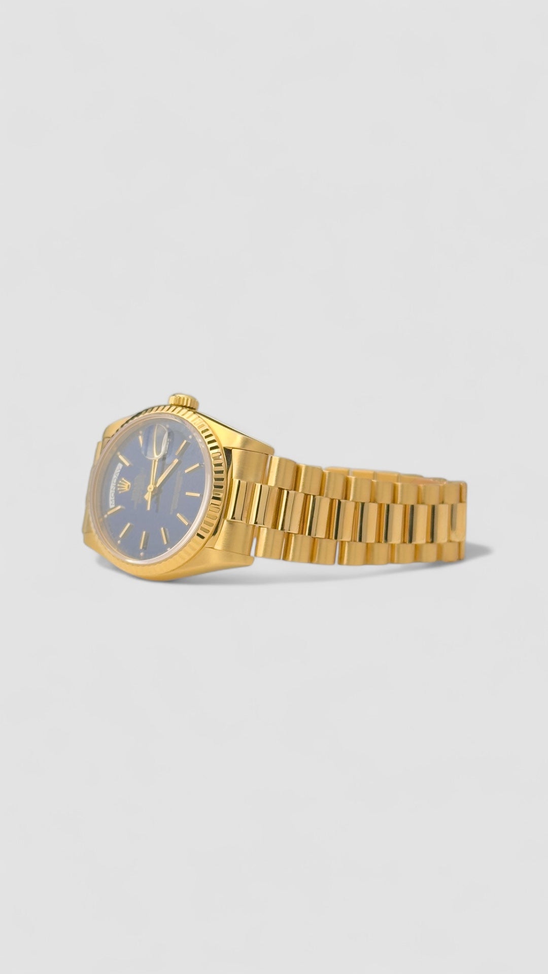 With its deep blue dial and warm 18K gold tones, the Rolex Day-Date exudes refined sophistication and timeless appeal. Its Swiss automatic movement ensures exceptional precision and performance, while the fluted bezel and President bracelet complete the unmistakable Rolex aesthetic.