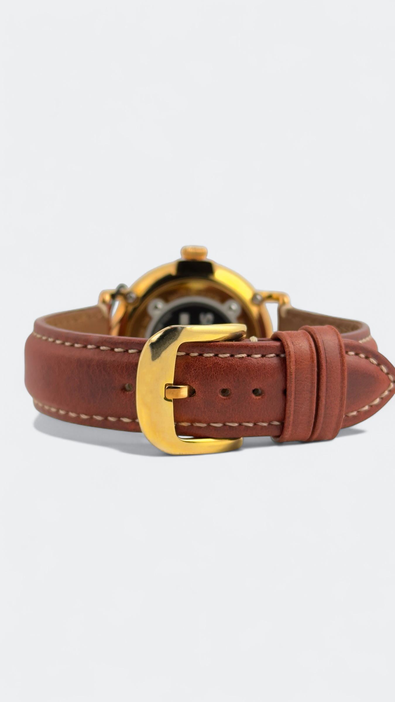 The polished gold-tone stainless steel case (41mm) surrounds a crisp white dial with a clean analog display, while the screw-down caseback adds refined detail and lasting strength.