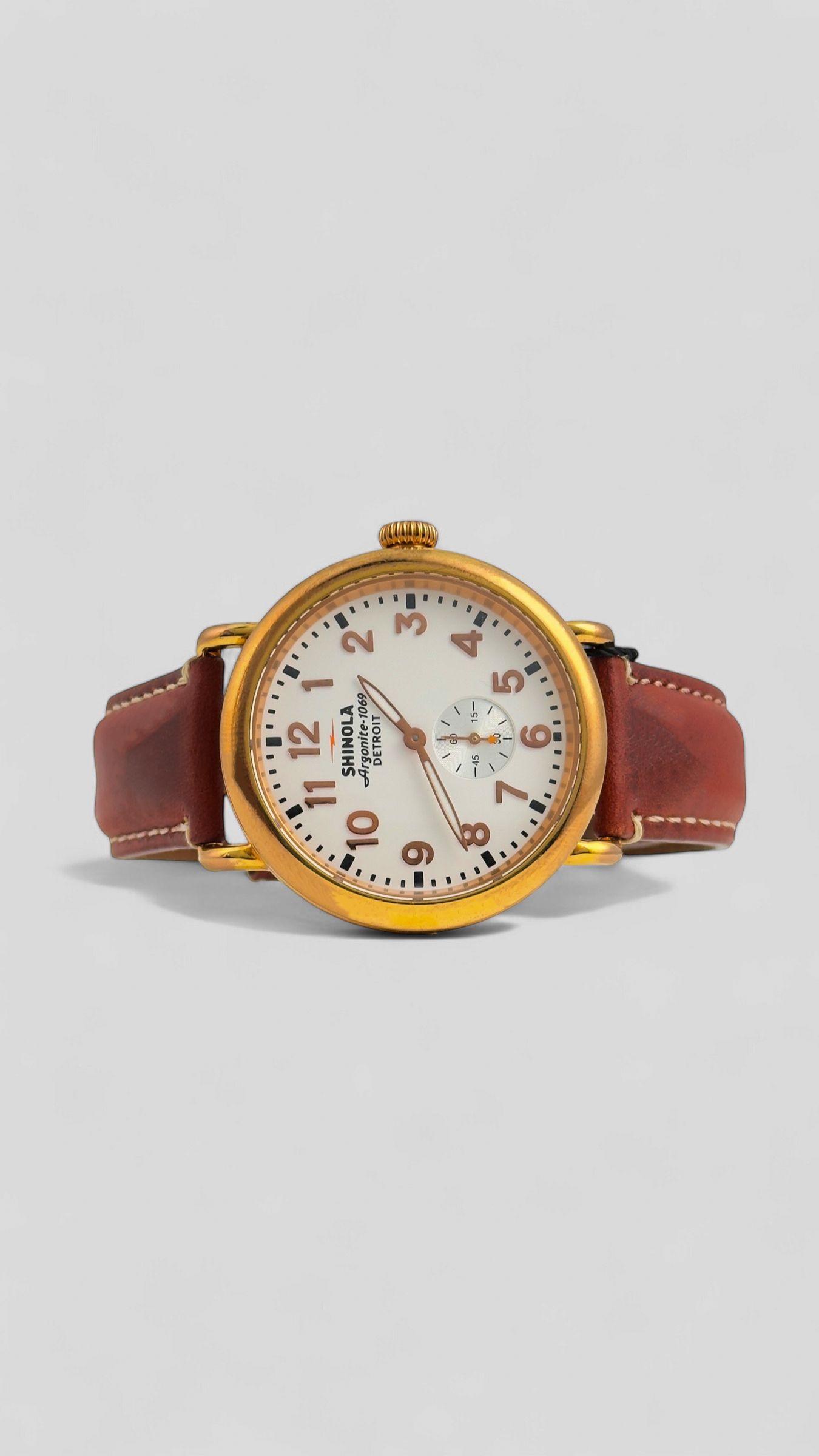 Shinola Runwell Men’s Quartz Watch – 41mm Gold-Tone Case, White Dial, Leather Strap