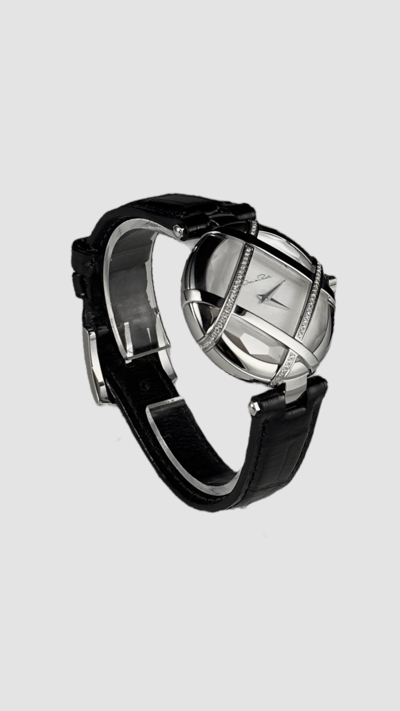 A standout feature is its faceted sapphire crystal, which enhances the dial’s depth and elegance. The watch is fitted with an original black genuine alligator strap and matching stainless steel buckle – both designed for lasting comfort and timeless style.